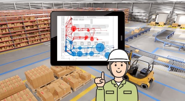 人やフォークリフトなどの動きを収集し、動線と滞留状況を見える化します。RFID を利用した新発想の仕組みで実現しており、倉庫や図書館などさまざまなところでご活用いただいています。